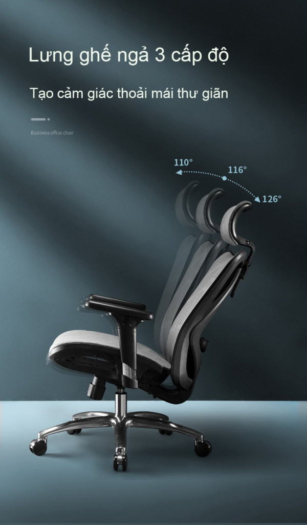 Khả năng nghiêng tối đa lên đến 126 độ, cùng với tựa đầu và phần tay đa chiều, giúp tạo ra một khoảnh khắc nghỉ ngơi tuyệt vời và nhanh chóng hồi phục tinh thần. Sự chắc chắn của phần lưng ghế được đảm bảo bởi trục chịu lực và cần gạt nằm phía sau.