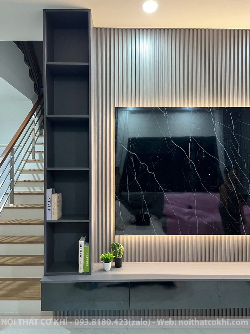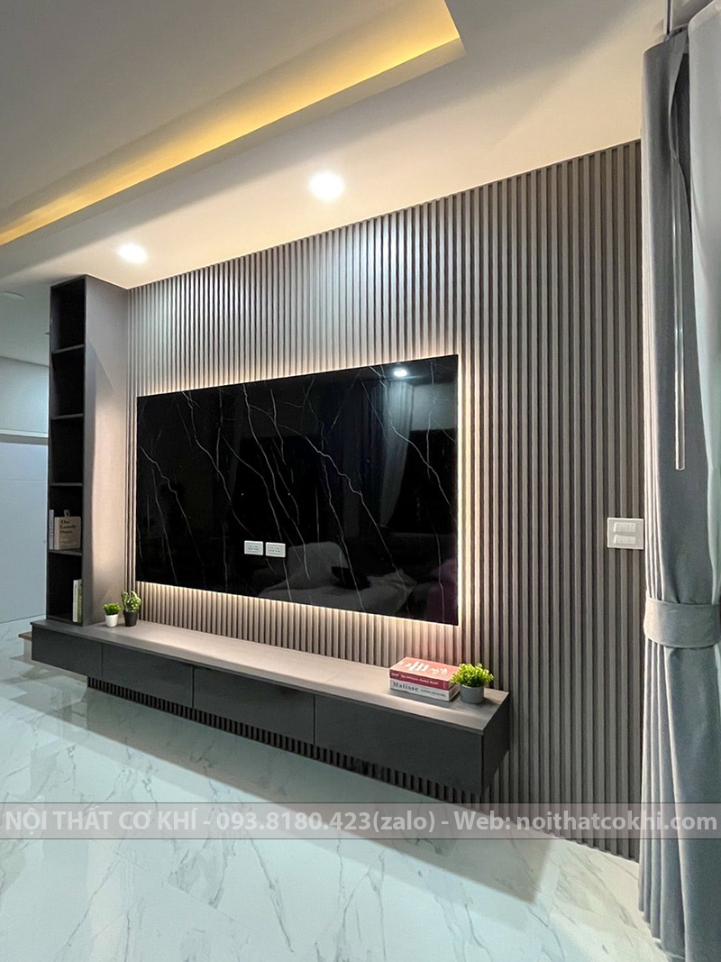 Vách Tivi Đẹp VTV5 là kiểu vách ốp trang trí phía sau tivi, một phần không thể thiếu trong nội thất dùng cho phòng khách hoặc phòng ngủ. Thiết kế bao gồm kết hợp kệ tivi, tủ trang trí, lam gỗ, đèn LED. Sự phối hợp này đang rất được ưa chuộng trong thiết kế nội thất vì vừa thanh lịch – tối giản, vừa ấm áp – sang trọng, phù hợp nhiều phong cách như Scandinavian, hiện đại, Minimalist. Vách kệ tivi tạo điểm nhấn, giúp không gian thêm ấm áp và tiện nghi. Phù hợp cho nhà phố, chung cư, biệt thự.