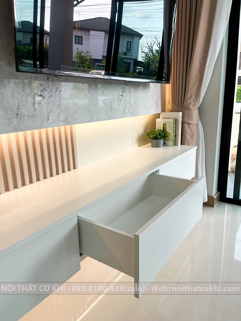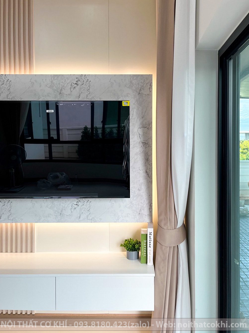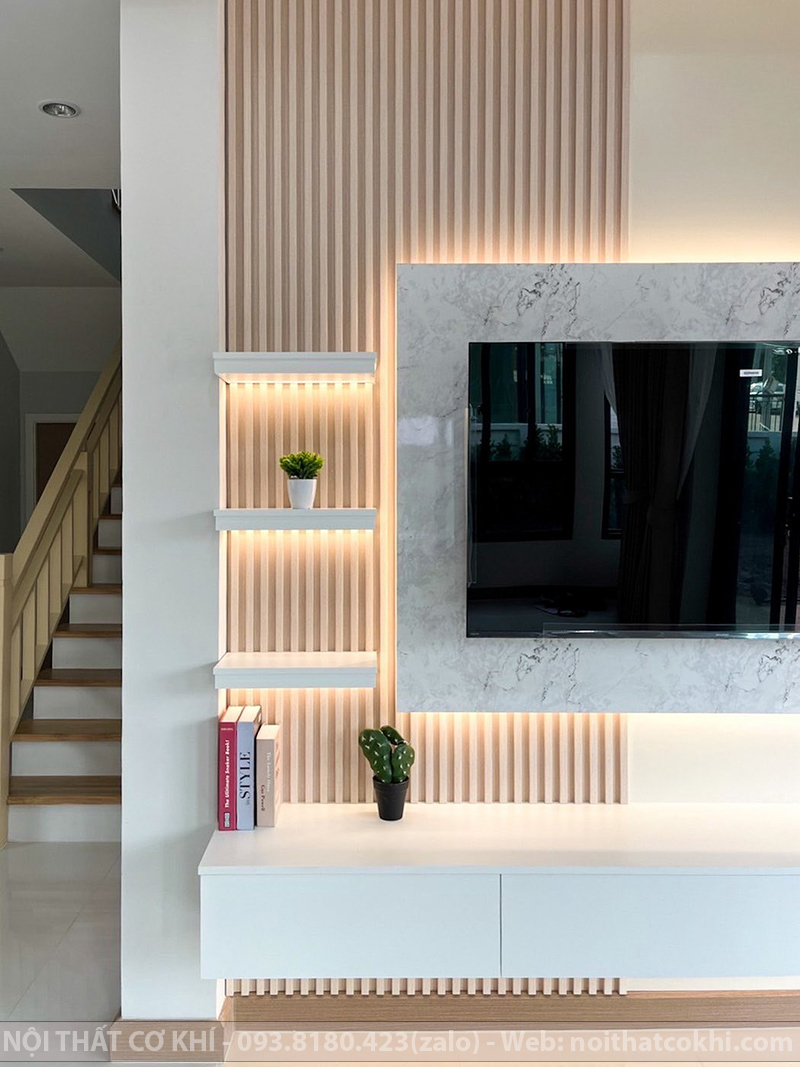 Vách Tivi Đẹp VTV8 là kiểu vách ốp trang trí phía sau tivi, một phần không thể thiếu trong nội thất dùng cho phòng khách hoặc phòng ngủ. Thiết kế bao gồm kết hợp kệ tivi, tủ trang trí, lam gỗ, đèn LED. Sự phối hợp này đang rất được ưa chuộng trong thiết kế nội thất vì vừa thanh lịch – tối giản, vừa ấm áp – sang trọng, phù hợp nhiều phong cách như Scandinavian, hiện đại, Minimalist. Vách kệ tivi tạo điểm nhấn, giúp không gian thêm ấm áp và tiện nghi. Phù hợp cho nhà phố, chung cư, biệt thự.