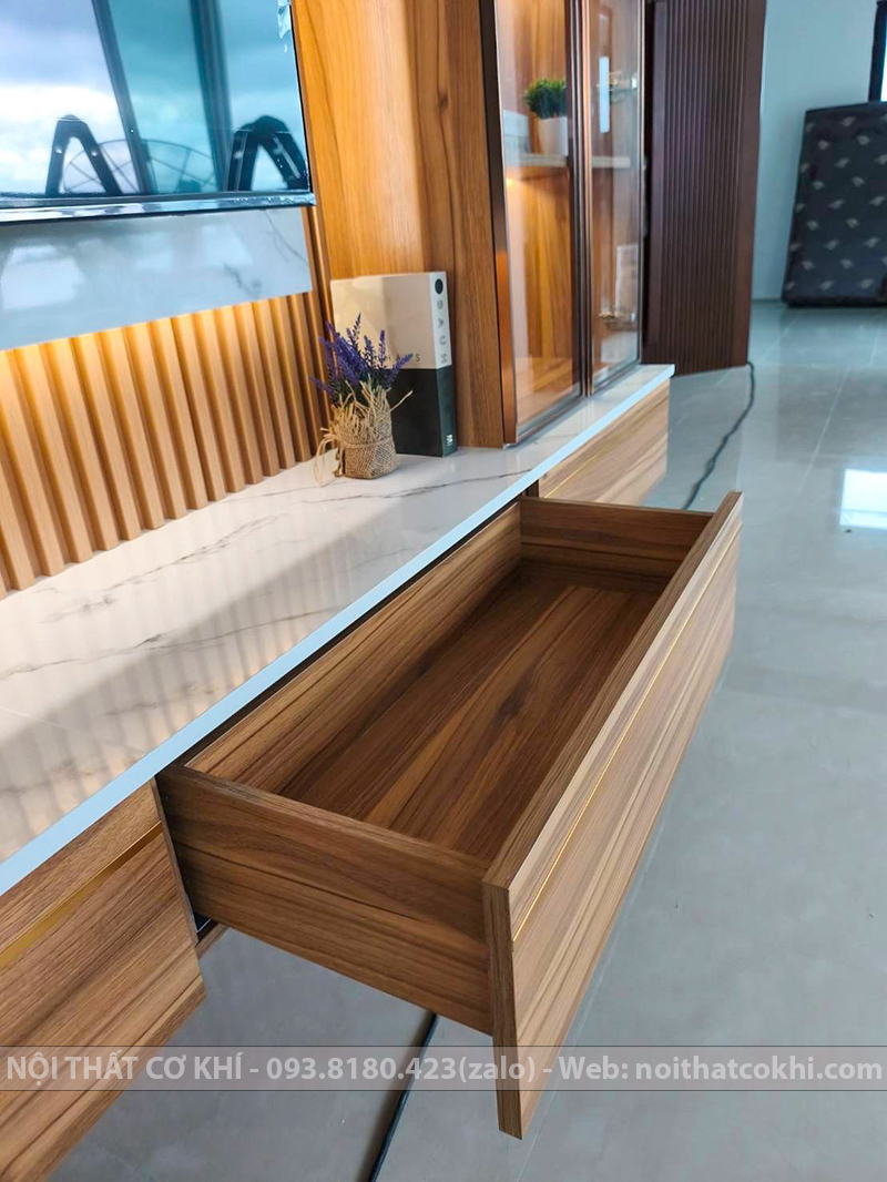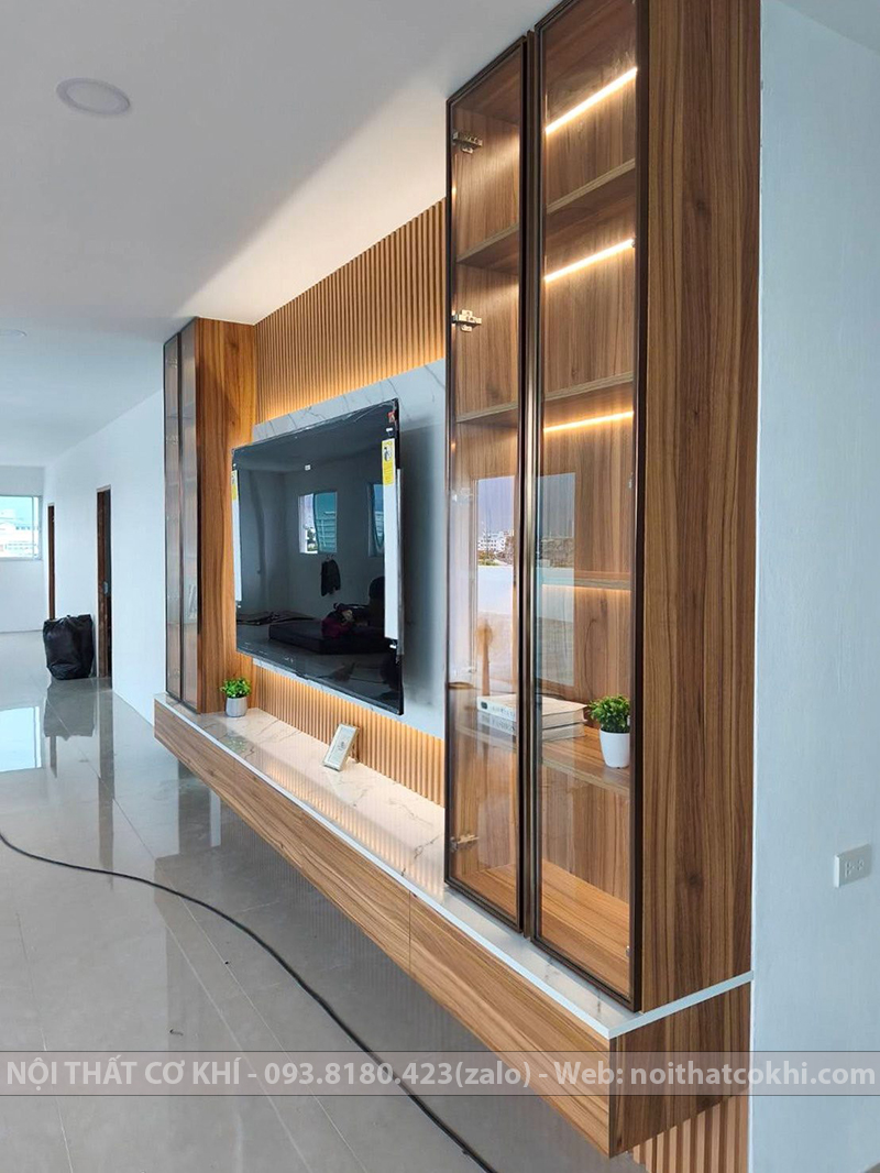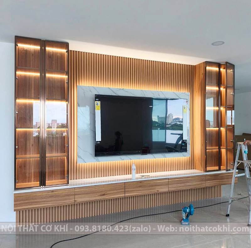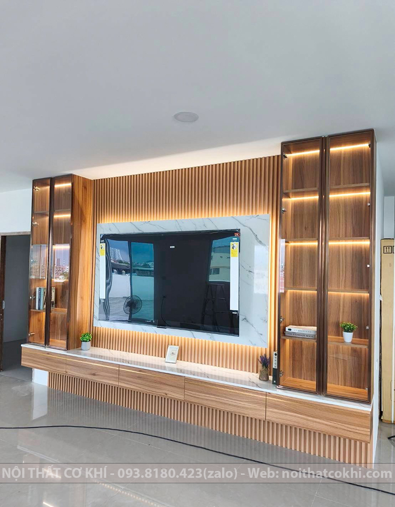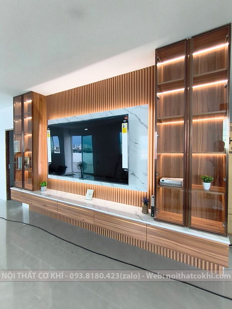 Vách Tivi Đẹp VTV9 là kiểu vách ốp trang trí phía sau tivi, một phần không thể thiếu trong nội thất dùng cho phòng khách hoặc phòng ngủ. Thiết kế bao gồm kết hợp kệ tivi, tủ trang trí, lam gỗ, đèn LED. Sự phối hợp này đang rất được ưa chuộng trong thiết kế nội thất vì vừa thanh lịch – tối giản, vừa ấm áp – sang trọng, phù hợp nhiều phong cách như Scandinavian, hiện đại, Minimalist. Vách kệ tivi tạo điểm nhấn, giúp không gian thêm ấm áp và tiện nghi. Phù hợp cho nhà phố, chung cư, biệt thự.